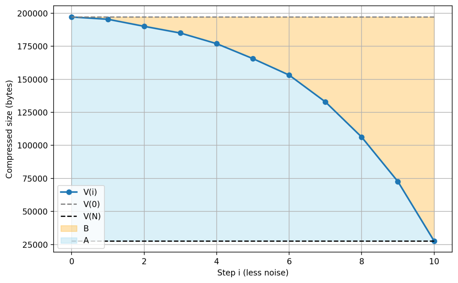 For those who like mathematical formulas, if we take N steps of progressively less noise, and define V(i) as the compressed size at step i, the formula is: